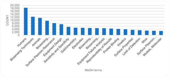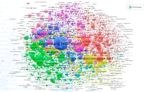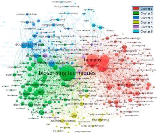 The study has also examined in some detail the keywords associated with the publications. Due to the choice of database, MeSH terms have a larger presence in this dataset. In a co-occurrence analysis, the top five MeSH terms were identified as biosensing techniques, humans, surface plasmon resonance, animals, and equipment design. In a similar analysis of Other Terms, the top five keywords were identified to be biosensor(s), surface plasmon resonance, aptamer(s), gold nanoparticle(s), and fluorescence. Moreover, we identified various clusters or grouping of different topics within the publications and by overlaying a time dimension on the findings, a temporal sense of emerging topics over the years has been presented.