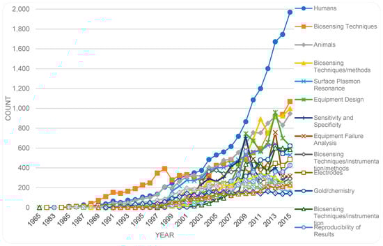 To form an understanding of the topical discussions in a field, a study of keywords can be useful. The starting point for this study was to form an overview of the developments in publications on biosensors based on uniform and consistent keywords to provide a level of stability in the comparisons over time. While author keywords are very useful and insightful, the choice of terms by individuals can vary from paper to paper and author to author. For example, different authors can use different keywords to indicate biosensors as a main topic in their papers. Therefore, an early decision in the study became to analyze trends based on a uniform set of keywords. That, in combination with other criteria (e.g., the extent and availability of relevant data, ease of access for multiple downloads and experimentation, etc.), defined the choice of database to become PubMed due to the presence of its MeSH terms.