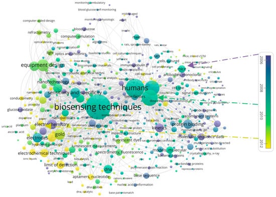 An examination of the terms in green (i.e., those with an average year of publication in middle of the color spectrum, e.g., biosensing techniques, human, electrodes) indicates that those terms have been continually used. Keywords marked in light green or yellow, however, have a more recent average year of appearance. Among these, as listed in Table 7, one can find terms optical imaging, limit of detection, and electrochemical techniques.