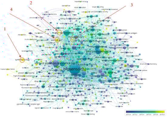 As mentioned earlier, Author keywords are only indexed since 2013 and, hence, they are not present in all items of the dataset affecting the average publication years. With that in mind, a temporal dimension is overlaid, by changing the color scheme (Figure 23). A list of the recent terms (with average year of publication being 2016) is provided in Table 9. In Figure 23, the top four terms that have emerged in more recent times (as presented in Table 9) have been marked with numbers including (1) synthetic biology, (2) smartphones, (3) fluorescent biosensor, and (4) electrochemical biosensor(s).