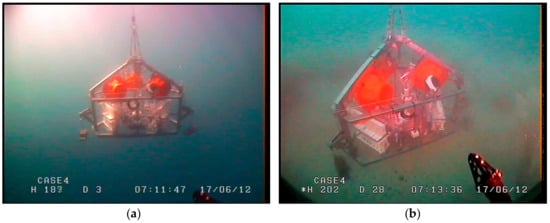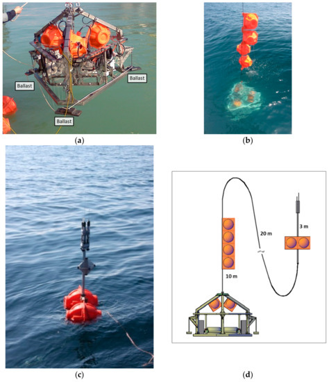 In the present configuration, the lander weighs 294 kg in air and 131 kg in water and the 4 buoys have a buoyancy in seawater of 1040 kg, whereas the ballast weighs 45 kg (15 kg per weight). The buoys are tethered to the tripod with a rope 10 cm in thickness and 5 m in length (Nautilus Marine Service GMBH, EDDYROPE). Another rope, 10 cm in thickness, is tied to the recovery pole. The pole is fitted with 2 buoys the same size as the 4 buoyancy array buoys and with a 10 kg ballast weight, to support the recovery devices about 2 m above the sea surface (Figure 2d).