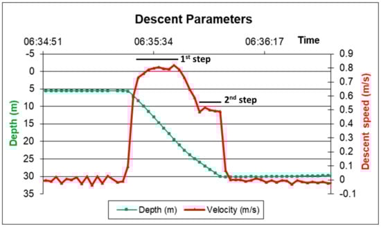 Amerigo Lander descent data. The data refer to the setup with three benthic chambers. Red line: Descent and landing speed. First step: Speed before activation of the first 2-buoy array; Second step: Speed after activation of the two buoys of the recovery pole. Green line: Depth profile.