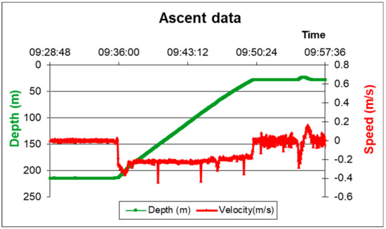 Amerigo Lander ascent data. The data refer to the setup with three benthic chambers. Red line: Ascent speed. Green line: Depth profile.
