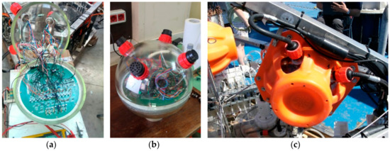 The electronics and the batteries are hosted in glass spheres built for depths of up to 7000 m (Nautilus Marine Service GMBH, VITROVEX Deep Sea Instrument Sphere; size: 13", outer/inner diameter: 330/306 mm, glass type: DURAN 8330), which are connected to the electronic devices, sensors, probes, and thrusters by marine connectors (Figure 7). The glass spheres are also commercially available and cost less than metal cylinders.