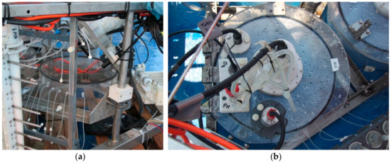 Each benthic chamber is also equipped with a stirring system, consisting of a rotating paddle mounted on the chamber lid (Figure 9a). The paddle is actioned by the coupling of an electric motor (CBF Motors SRL, CRB35GM, CBF motors srl, Lissone, Italy) to a permanent Neodymium magnet (Supermagnete, magnetic disk diameter 30 mm, height 15 mm, Neodymium, N42, nickel-plated, Webcraft GmbH, Gottmadingen, Deutschland). The paddle turns at a speed of 4–6 rpm, reproducing the hydrodynamics near the seabed, which is responsible of the formation of the benthic boundary diffusion layer at the sediment-water interface and, consequently, of the intensity of the benthic fluxes of dissolved chemical species. The motors of the rotating paddles are also activated by the lander’s software some minutes after closing of the lid.