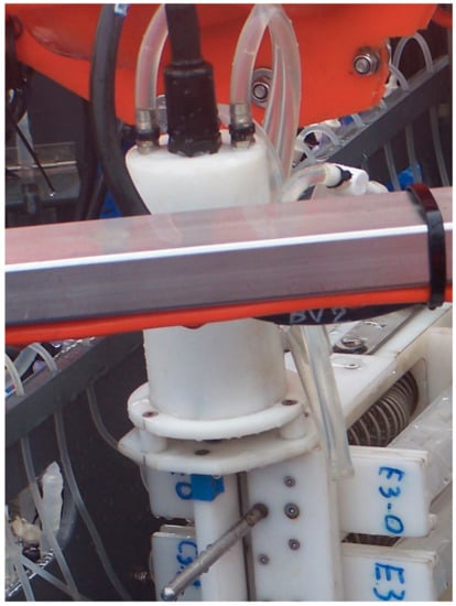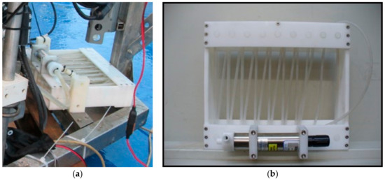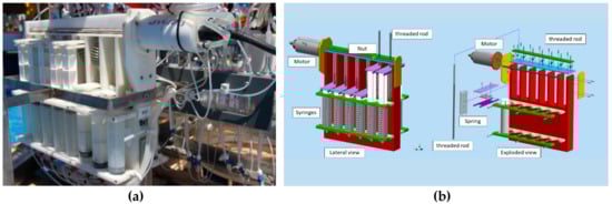 Each benthic chamber is connected (Figure 9a) by silicone tubes (inner diameter, 1.5 mm, outer diameter 3 mm) to a water sampling device (VAMPIRE) to collect water or to introduce tracers into the chambers (Figure 11). The VAMPIRE consists of a Delrin frame hosting 8 pairs of syringes, each pair capable of collecting/injecting a maximum volume of 280 mL of water or tracer. If one syringe of the pair is not connected to the inside, seawater outside the chamber can be collected while the other syringe draws water inside the chamber. Each couple of syringes is activated by a nut moving on a rotating stainless-steel rod. The nut moves the levers that release the stainless-steel springs, which actuate the syringe pair in suction or injection mode. The rod is controlled by an electric motor (CBF Motors SRL, CRB35GM, CBF motors srl, Lissone, Italy) which is powered on and off by the lander’s software. Its timing and the activation of water sampling or tracer injection can also be set by the lander’s software.