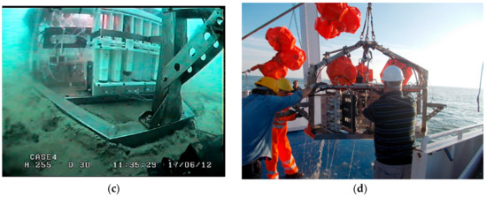 The Amerigo Lander photographed in some operational phases: (a) In the water before release; (b) on the seabed (view from above); (c) on the seabed (lateral view); and (d) on board after recovery.