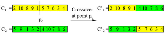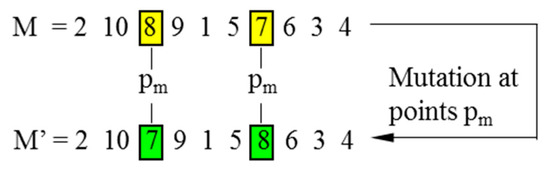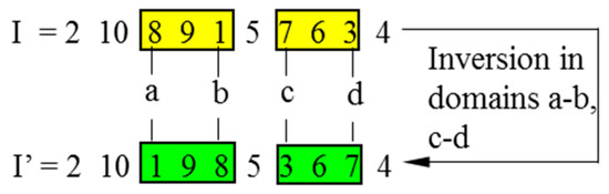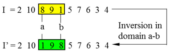 In CGAs, the crossover is performed to concatenate parts of two parent chromosomes, which are separated by determined break points, and generate two offsprings with a certain crossover probability (PC). Meanwhile, the mutation interchanges the positions of genes at two randomly chosen mutation points in a single chromosome. Accordingly, the mutation occurs with a certain mutation probability (PM). It should be noted that the crossover helps the population to converge by making the chromosomes alike, whereas the mutation brings the genetic diversity back into the population in case of the local optimum. In this paper, the single-domain inversion-based algorithm (SDIGA) is presented with a further inversion operation added after the mutation in the CGA. Two different genes in a single chromosome are defined as inversion points, between which the fragment is named an inversion domain. The fragment is then turned through 180° (inversed) and inserted back into the original position of the chromosome. The schematic layouts for crossover, mutation, and single-domain inversion are illustrated in Figure 2, Figure 3 and Figure 4, respectively.