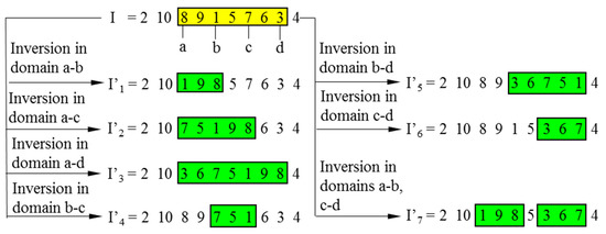 Inspired by the above discussion, the MDIGA is proposed based on multi-domain inversion to increase the number of inversion domains and child chromosomes. As shown in Figure 6, four inversion points, named a–d, are randomly defined in the encoded string. Six child chromosomes I’1- I’6 are generated by a single inversion within domains a-b, a-c, a-d, b-c, b-d, and c-d, respectively. Similarly with the DDIGA, I’7 is generated by double inversions within domains a-b and c-d. The parent and seven child chromosomes are then sorted according to the fitness function 1/D (D is the path length of each chromosome). Only the most advantaged chromosome I’ (I’5 in this case) is reserved for the next generation, while the others would be eliminated completely.