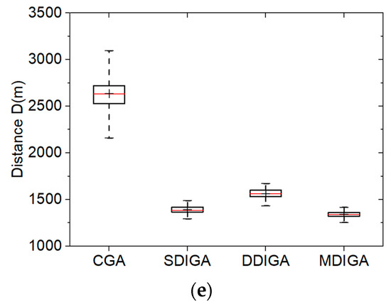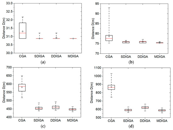 As shown in Figure 8a, all the three improved algorithms, especially the SDIGA and the MDIGA, effectively reduce the optimal path distance and improve the algorithm robustness in comparison with the CGA. In addition, the median value is almost coincided with the mean value in each bar; this means all the algorithms could produce uniformly distributed data under the working condition of eil51.