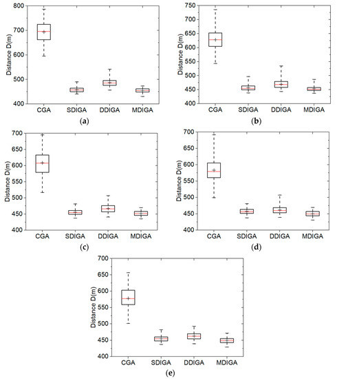 As shown in Figure 8b–e, evident influence appears that the overall optimal distance is further reduced for each algorithm when S increases. Although the robustness of every algorithm changes a little due to the population size, no regular tendency could be found. Furthermore, the algorithm with double-domain inversion fails to outperform the SDIGA in both reducing optimal path distance and improving algorithm robustness, which is not in accordance with our supposition as mentioned in Section 2.2. By contrast, the MDIGA is the most advantageous algorithm for the TSP. In the case of S = 60, the mean distance and the standard deviation of MDIGA are 451.63 m and 7.72 m, which are 25.8% and 79.2% smaller than that of CGA, respectively. Detailed statistics, including the worst, the best, the mean, and the standard deviation values of optimal path distance are shown in Table 5.