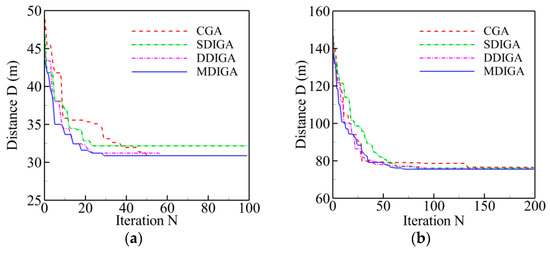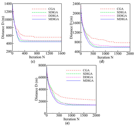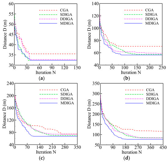 The convergence history of optimal path distance versus iterations for each algorithm under four working conditions are shown in Figure 14 with detailed information listed in Table 7. Similar conclusions with Figure 9 could be drawn as follows. The MDIGA is superior among the four compared algorithms. Meanwhile, the advantages of the MDIGA in accelerating the convergence and optimizing the path distance become more obvious with the increase of P. When P = 45 for instance, the curve of the MDIGA converges at Ncri = 186 and obtains the optimal path distance of 77.1 m, which is 33.1% shorter than that of the CGA. In addition, the DDIGA fails to outperform the SDIGA. The trajectory planned by the DDIGA is slightly longer than that of the SDIGA in most cases, as shown in Figure 14a–c. Furthermore, the three improved algorithms require more time for computation than the CGA under the same Nmax. However, the MDIGA is not the most time-consuming algorithm, which indicates a desirable capability of balancing the path optimization and the time consumption.