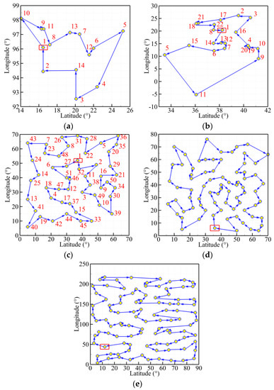 Furthermore, Figure 10 presents the best trajectories of the five TSPLIB instances (burma14, ulysses22, eil51, eil76, rat99) using the MDIGA. The abscissa and ordinate stand for the values of latitude and longitude of every planned point, respectively. The red number is the sequence of randomly generated points. The start point is enclosed in a red rectangle, and the arrows represent the heading of planned path.