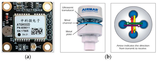 The navigation, guidance, and control (NGC) system is contained in the hull, with guaranteed waterproof capability. It consists of three module subsystems: the navigation data processing subsystem, path planning subsystem, and autopilot subsystem. In the first subsystem, multi-sensors including electronic compass and GPS (in Figure 12a) are employed for acquiring the direction of the bow and the USV’s location data. An ultrasonic weather sensor, produced by AIRMAR® (Model: WeatherStation® PB200, shown in Figure 12b), is used to collect the real-time, site-specific weather and location information. All the voltage signals from the aforementioned multi-sensors are collected by a navigation data acquisition (DAQ) system. The navigation data is stored in real-time along with ship log and status information.