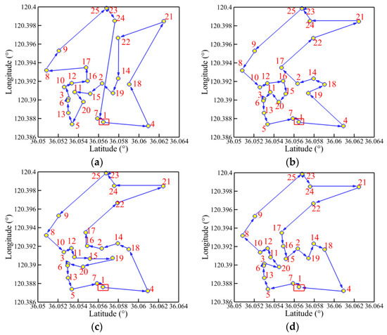 Figure 15, Figure 16, Figure 17 and Figure 18 present the optimal trajectory of each algorithm under each working condition. When there are 15 planned points in Figure 15, the SDIGA and the MDIGA perform better with fewer corners than the CGA around points 3, 12, and 15. Moreover, the trajectories become more complex with more evident differences in path shape and distance as P increases. The trajectories generated by the CGA and DDIGA have different levels of path-crossing phenomena in Figure 16a, Figure 17a,c, and Figure 18a; this would be the reason why a longer route distance is generated when compared with the other algorithms under the same condition. However, at the same time, the advantages of the MDIGA reflect more obviously in reducing the path length effectively and simplifying the path shape, especially when more planned points are considered. The reason behind this may be that a larger number of offsprings and the reservation of the fittest individuals could help avoid the local optimum and converge to the optimal solution.