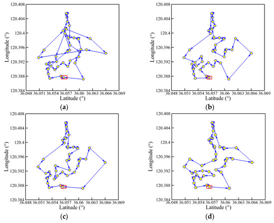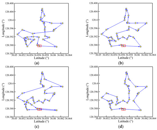 Corresponding to four working conditions, four numbers of planned points are selected randomly in a practical environment near the Qingdao Olympic Sailing Center at Fushan Bay: 15, 25, 35, and 45. Every condition has the same start point of (N 36°03′22.38″, E 120°22′57.06″) in latitude and longitude. For the location coordinates of other planned points, refer to Table A1, Table A2, Table A3 and Table A4. The four aforementioned GAs are then employed separately to the USV model for comparison of their effectiveness of path planning. The population size (S) is set as 100. The maximum numbers of iterations (Nmax) are 150, 250, 350, and 450, respectively, which are dependent on the numbers of planned points. In addition, the crossover probability (PC) and the mutation probability (PM) are still 0.90 and 0.10.