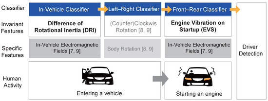 As shown in Figure 1, ADDICT consists of an in-vehicle classifier (IVC), a left–right classifier (LRC), and a front–rear classifier (FRC). Considering the fact that vehicle-riding actions are always preceded by walking to and standing by a vehicle, we identify the moment when the user is about to enter the vehicle using accelerometer values as employed in [7,9,10,11]. If the user is found to be standing by the vehicle, the IVC is triggered to determine whether or not the user enters the vehicle by monitoring upcoming user actions. The IVC hinges on an invariant feature, a difference of rotational inertia (DRI), from gyroscope and magnetometer readings (see Section 2.2 for details).