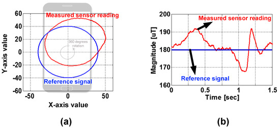 Discrepancy between measured and reference values of magnetometers: (a) magnetometer’s values while a smartphone is rotated by 360, and (b) magnetometer readings in the time domain.