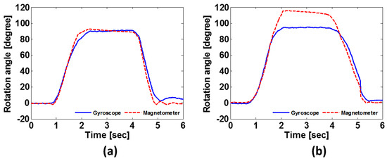 How the rotation angles of the magnetometer and accelerometer vary when the smartphone is turned by 90: when (a) there is no electrical interference, and (b) electrical interferences exist.