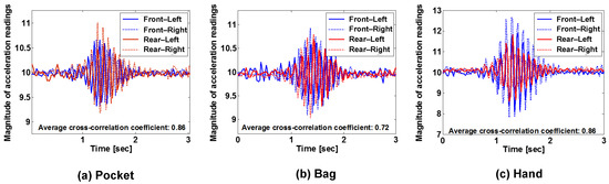 It is important to employ a new feature for engine startup that appears regardless of the smartphone’s position. After monitoring various sensor readings by varying smartphone positions and types of vehicles, we find the accelerometer is suitable for sensing the EVS. Figure 4 plots variations in the magnitude of acceleration during the startup of engines. From the figure, all of the magnitude changes follow similar patterns, i.e., lasting around 1 s of vibration, experiencing a slight increase after the engine startup, and then gradually decreasing over time. We use a correlation coefficient (for each smartphone position) to quantify the similarity of EVS among different seat positions. The average correlation coefficients are computed as 0.86, 0.72, and 0.86 for the cases of smartphones held in pockets, bags, and hands, respectively. This means EVS is highly correlated with smartphone location since the coefficients are larger than a threshold of 0.6 [14,15]. In addition, we compute the similarity of smartphone positions in terms of cross-correlation coefficients (mean ± standard deviation) as follows: