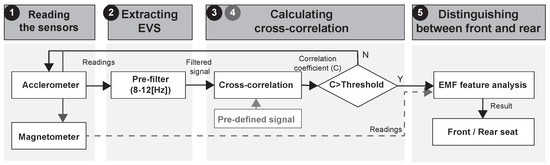 After identifying the boarding-side, the FRC is triggered to differentiate seated rows, front or rear, using an invariant feature produced when the engine is turned on. According to [7,9], starting the vehicle causes a subtle in-vehicle EMF fluctuation with a relatively greater magnitude around the driver’s seat than the rear seats. However, manipulating the smartphone also causes EMF readings to fluctuate, causing false alarms by classifying the user seated in the rear as being in the front. To overcome this problem, we exploit engine vibrations monitored by the accelerometer when starting a vehicle, which cannot be easily generated by the users. By using the engine vibrations on startup (EVS), FRC achieves accurate classification results (see Section 2.3 for details).