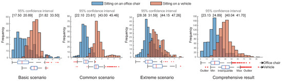 Since the characteristics of each distribution representing six different experimental conditions shown in Table 2 were unknown, we first conducted the normality test called the Shapiro–Wilk W test [16] to validate whether these distributions, shown in Figure 7, follow the Gaussian behavior. The test results in Table 2 indicate that most of the distributions did not follow the Gaussian behavior, except for the vehicle-riding actions under the basic scenario.