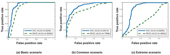 The performance of the IVC is further evaluated against the magnetic field variance detection (MVD) [7,9]. Figure 8 shows the ROC curves and AUC values of the IVC and MVD under three scenarios. As expected, MVD had AUCs of 0.85, 0.79, and 0.49 in the basic, common, and extreme scenarios, respectively. This means that MVD could not differentiate vehicle-riding-actions and non-vehicle-related sitting actions. In contrast, the IVC achieved AUCs of 0.92, 0.90, and 0.82 for the three scenarios, which means that the IVC outperforms MVD and maintains a high performance even in the extreme settings.
