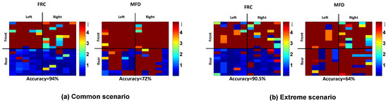 Results of front vs. rear classification in (a) the common scenario, and (b) the extreme scenario. MFD—magnetic field fluctuation detection.