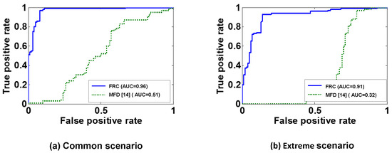 ROC curves and AUC values of the FRC and MFD under the common and extreme scenario.