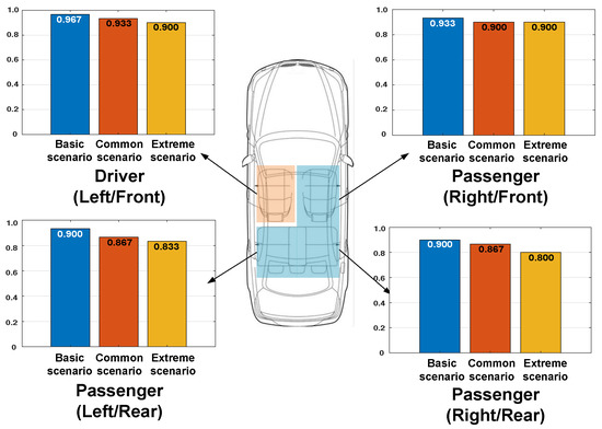 We distributed ADDICT-enabled smartphones to the participants and conducted experiments in three vehicles by varying smartphone positions and scenarios. Figure 11 shows the results of each seat position. ADDICT achieved very high accuracy for detecting the driver, i.e., 96.7%, 93.3%, and 90.0% for the basic, common, and extreme scenarios, respectively. In addition, it accurately detected passengers’ seats with an accuracy of 93.3~90.0%, 90.0~86.7%, and 90.0~80.0% for the three respective scenarios. These results clearly demonstrate that ADDICT maintains a high level of accuracy in distinguishing between the driver and passengers, even in extreme (or real-world) settings.