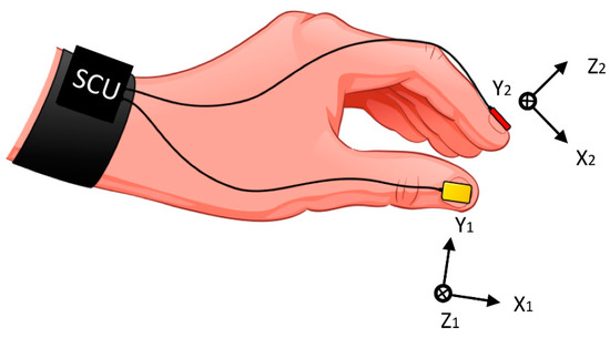 Illustration of the inertial sensor system, with local coordinate systems of the thumb and index finger sensors. SCU-sensor-control unit.