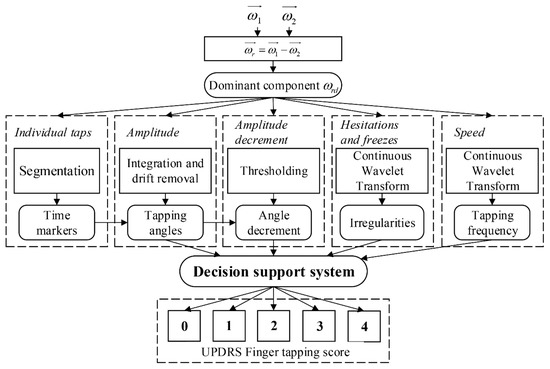 The parametric result comprises features that can be directly correlated with biomechanical properties of the movement and can, therefore, be used to assist physicians during the assessment of bradykinesia in repetitive finger-tapping. For such a purpose, we implemented the time-frequency method continuous wavelet transform, which allows us to evaluate temporal changes in the tapping frequency and to detect irregularities in rhythmic tapping behaviour, such as hesitation and freezes. Numerical integration and drift removal were used for estimation of tapping angle apertures that are calculated for each tap. Temporal changes in the angle apertures were found and described by the index of the first tap with a significant amplitude decrement (compared to previously achieved tapping angle amplitudes). The final feature set is used as the input into the decision support system.