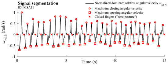 In order to evaluate characteristics of the tapping performance for individual taps, segmentation of the dominant component of the relative angular velocity was performed. A moving-average filter was applied to the observed signal with a span equal to , where represents the basic tapping frequency extracted from the spectrum. The filtered signal was normalized to its maximum value. From the obtained sequence, areas above and below were identified, corresponding to regions where positive peaks and negative valleys are located, respectively. Local extrema were identified for each of the extracted regions. Positive peaks correspond to the maximal closing velocity (circles, Figure 3), whereas negative valleys represent moments when fingers achieve the maximal opening velocity (squares, Figure 3). The samples in which the smoothed angular velocity passes through a zero value for the first time were identified between each neighbouring maximum and minimum marker. These samples represent the moments when fingers are closed (“zero posture”). The sequence was complemented with the first and last sample. The finally obtained samples were identified as time markers for drift removal and segmentation on individual taps (crosses, Figure 3).