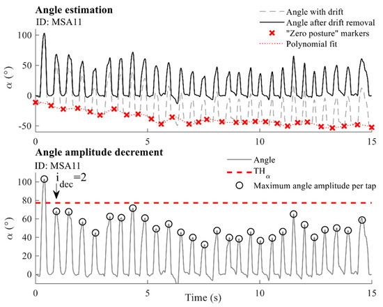 Upper panel: Angle estimation. The dashed grey line marks the drifted angle sequence, and the solid black line corresponds to the angle sequence after drift removal. Red crosses show “zero posture” markers, and the dotted red line presents the polynomial fit used for drift removal. Lower panel: Angle amplitude decrement. The solid grey line shows the angle sequence, whereas black circles mark the angle amplitudes (highest finger apertures) per tap. The dashed red line presents the threshold used for the detection of decreased amplitudes. The example is given for one MSA patient (ID: MSA11).
