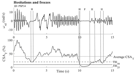 Calculation of hesitations and freezes: angular velocity (upper panel) and calculated characteristic (bottom panel). The solid grey horizontal line marks the average value. The dashed grey horizontal line corresponds to the upper threshold of the average value. The dotted black horizontal line shows the lower threshold of the - average value. Similarly, dotted grey vertical lines show areas that are classified as hesitations (an “H” mark) and freezes (an “F” mark). The example is given for one PSP patient (ID: PSP14).