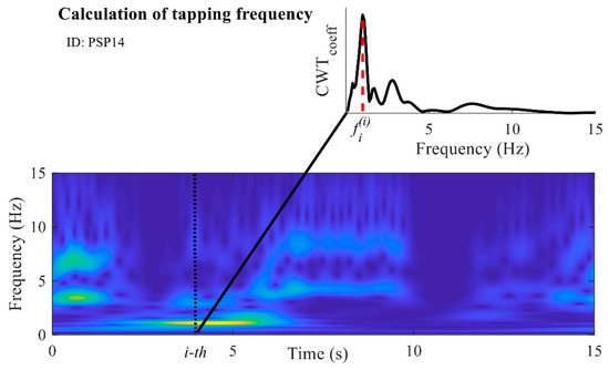An important criterion for evaluation of bradykinesia in the finger-tapping task is the tapping speed. During the evaluation, neurologists examine how fast subjects are tapping. If subjects tap faster, then during those 15 s of the tapping test they perform a larger number of taps, and vice versa. Although this can also be evaluated from the number of performed taps and their duration, by using the calculated matrix of CWT coefficients, the dominant tapping frequency can be found for each time sample. In this way, all changes of the tapping rhythm are assessed, detected, and included in the analysis. The vector of coefficients corresponding to one sample was extracted from the CWT matrix. From the obtained vector, the most prominent frequency was calculated as the frequency at which the coefficient with the highest value is located (as shown for the i-th sample in Figure 6). The procedure was repeated for all samples. In this way, the new frequency characteristic was obtained. The average value of the frequency characteristic was calculated and is marked as (Hz).