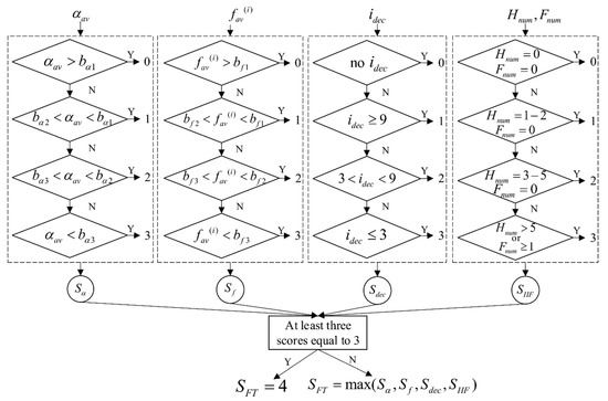 The block scheme of the decision support system. The system is divided into four processing blocks (bordered with dashed black rectangles). The inputs to the blocks are the calculated features: , , and respectively. Each block implements rules and assigns a subscore for the input feature. The final score is decided based on the results obtained from all four blocks.