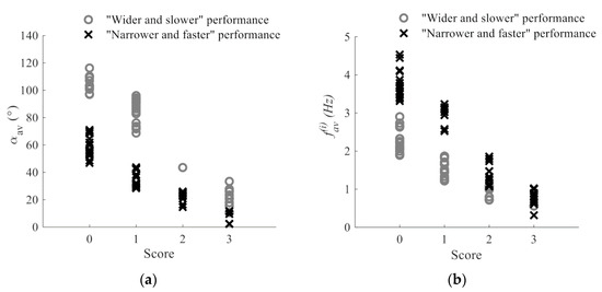 Dependency of: (a) calculated scores and the feature; (b) calculated scores the and feature. Grey circles mark samples that are assigned to the cluster (“wider and slower” performance), whereas black crosses correspond to members of the cluster (“narrower and faster” performance).