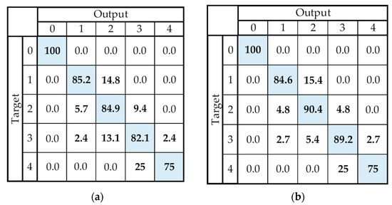 Presentation of results using the confusion matrix. (a) Case I—The result obtained when all recordings are included. (b) Case II—The result obtained using only recordings on which both raters agreed. The cells on the diagonal of the confusion matrix show the overall success rate for each score (expressed as a percentage (%)), whereas the cells outside the diagonal show the error rate for the scores (expressed as a percentage (%)).