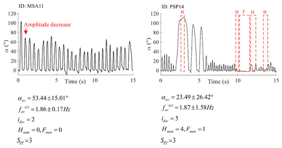 The result of the expert system comprising a graphical representation with detected irregularities, calculated features, and the final score. The example is given for one MSA patient (ID: MSA11), right hand, and one PSP patient (ID: PSP14), right hand.