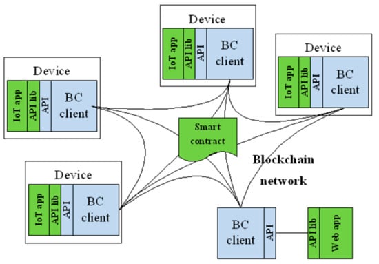 Web, mobile, or embedded applications combine regular application logic (e.g., for user interfaces, sensor data acquisition, local data processing) with BC capabilities. Such capabilities can include a simple transaction exchange in the BC network or communications with an on-chain application part, i.e., a smart contract. The IoT applications use the BC via BC client API libraries and the BC client APIs that are exposed by the BC clients. These functional blocks of the IoT application part are described in more detail in the continuation of this section.
