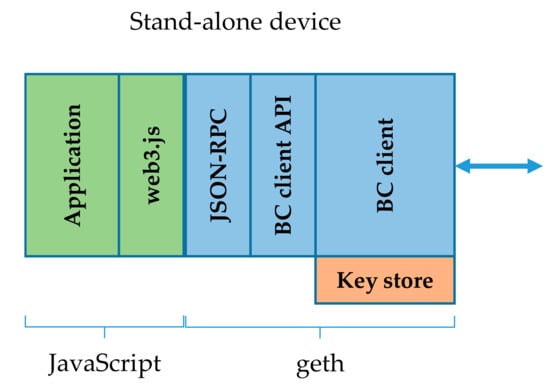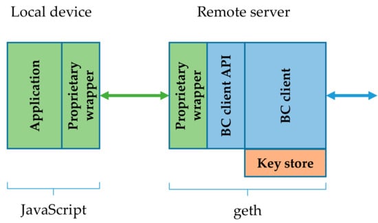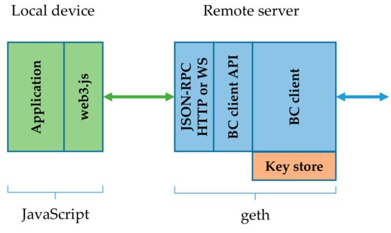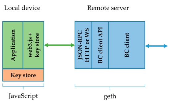 The remote geth client with local key store architecture—which is depicted in Figure 4—and the one with remote key store differ in how the key store is positioned. As this is no longer placed on the server, the security risk of sharing the same geth client among several devices diminishes. In fact, in terms of security, only the client’s availability remains a relevant issue. The blockchain data kept by the client is readily available in the BC network to any other participant and is not meant to be private. In this case, however, the application has to (create and) submit raw transactions, including the signature and apply proper serialization. Key store management and signing of transactions is already supported in the web3.js.