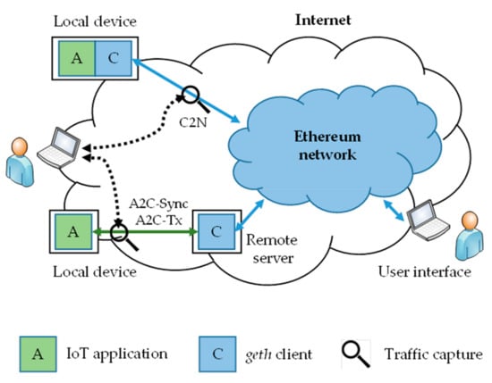 To be able to understand the full scope of possibilities and constraints of Ethereum-based decentralized applications, we had a prototype developed for an Ethereum BC-controlled IoT electric switch and smart meter, dubbed Swether, along with smart contracts and Ethereum-compliant web applications []. The application deployment options presented in this section and the communication traffic analysis were verified with this pilot DApp setup. We were running the system in the Ropsten public Ethereum test network. The traffic captures and analysis were made with Wireshark. We measured and analyzed the network traffic to the client and the traffic passed between the application and the geth client to get practical insight into possible communication constraints.