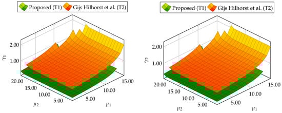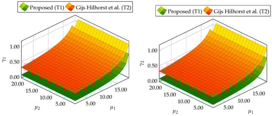At the beginning, the trade-off between , , , and depending on and is shown. In particular, 20 values of and were selected from a range between 1 to 20. Next, for each value of and , the optimization problem (59) was solved under constraints (35)–(42) for the proposed approach and constraints (47)–(54) for the alternative approach. Figure 1 shows the evolution of and for different and . From these results, it can be deduced that the proposed approach (Theorem 1) allows us to obtain lower values of and than results obtained using Theorem 2. Moreover, Table 1 contains the minimal values of and for which the constraints (59) are satisfied.