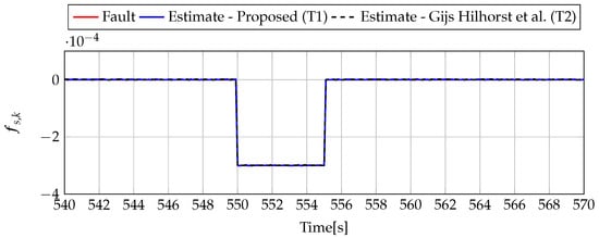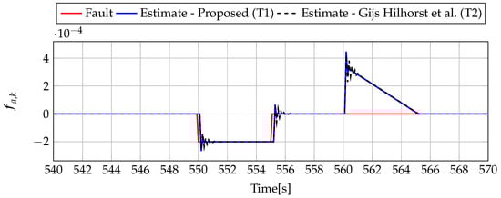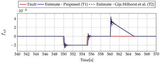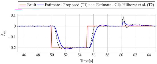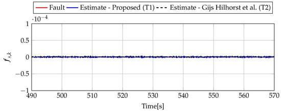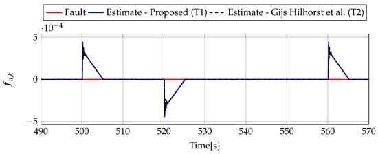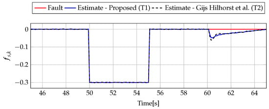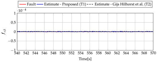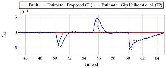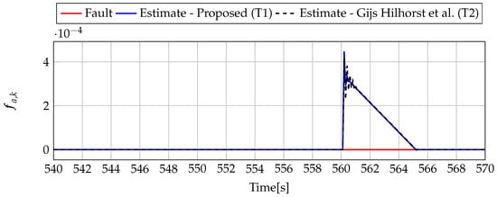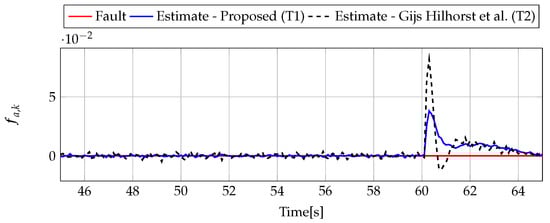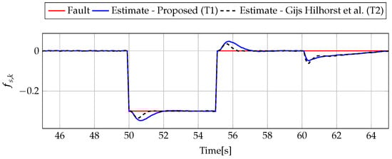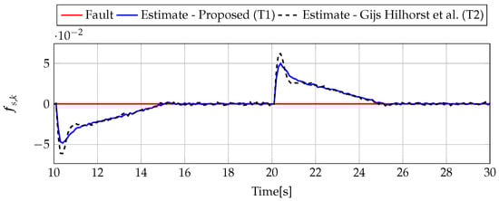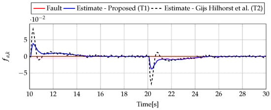 Sensor fault estimate for the fault-free case (for ) with Theorem 1 (T1) and Theorem 2 (T2) based on [] for disturbance signal .