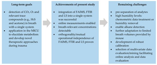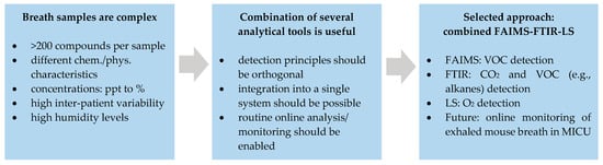 In order to implement a combined FAIMS-FTIR-LS system in a MICU, several obstacles have to be overcome. The selected methods have different experimental requirements, e.g., in terms of gas flow and pressure, measurement protocols, background recordings, and duration of individual measurements. These requirements need to be aligned for enabling simultaneous measurements in a combined system in an online monitoring scenario. In addition, the challenges common to breath analysis in general including, e.g., the detection of trace concentrations despite high humidity levels and complex background matrices need to be addressed. Last but not least, as already mentioned, additional challenges arise from the fact that sensing mouse breath requires sampling and analyzing small exhaled breath volumes (i.e., few hundreds of microliters) such that the mouse ventilation scheme is not negatively affected.