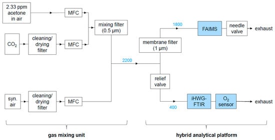 Experimental setup comprising the gas mixing unit and the hybrid analytical platform. Numbers in blue are gas flows in mL/min.