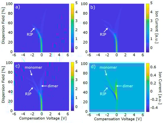 The dispersion plot of pure air (Figure 3a) mainly showed the reactant ion peak (RIP), which, in positive detection mode, appears due to the formation of ionized clusters of water molecules present in the carrier gas []. The faint vertical signal in Figure 3a at around 0 V CV was approximately constant for all recorded dispersion plots. Due to the immense sensitivity of FAIMS, this trace could not be erased throughout the whole project and was likely to be caused by substances emitted from the tubing and the FAIMS device itself. Following the instructions of this particular FAIMS system, this signal was used to establish a cleanliness criterion, i.e., the system was considered to be ready for reliable analysis only if the maximum peak intensity between −0.1 to +0.2 V CV at 54% DF was ≤ 0.08 a.u.