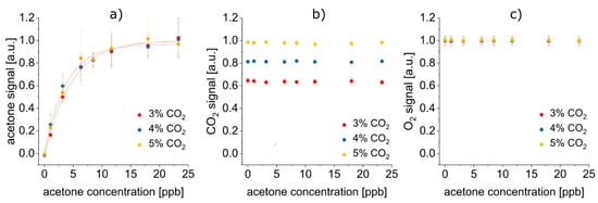 No mutual signal co-dependencies of acetone, CO2, and O2 were detected. All displayed error bars are 1σ error bars. (a) Acetone signals recorded with FAIMS depend on the acetone concentration (asymptotic fit y = A − B·Cx), yet, remains independent of the CO2 content. (b) CO2 signals recorded by iHWG-FTIR only vary depending on the CO2 concentration. (c) O2 signals recorded by LS are neither influenced by the acetone nor by the CO2 content.