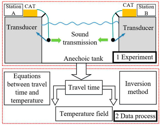 The whole process of using CAT to observe the temperature field is demonstrated in Figure 1. The CAT instruments equipped with a transducer are first installed in the observed area in an anechoic tank. Once the experiment begins, the instruments would send each other the M sequence acoustic signal, and the travel time can be obtained after cross-correlation. At the end of the experiment, the data from each instrument are collected and the relationship between travel time and temperature is established. Subsequently, the temperature field is mapped using the inversion method. Note that the propagation of sound in a small area (no more than 100 m of station spacing in this study) can be approximated as linear propagation. Hence, the length of the acoustic propagation path can be assumed to be equal to the station spacing, and the length of the direct path need not be calculated by ray-tracing simulation.